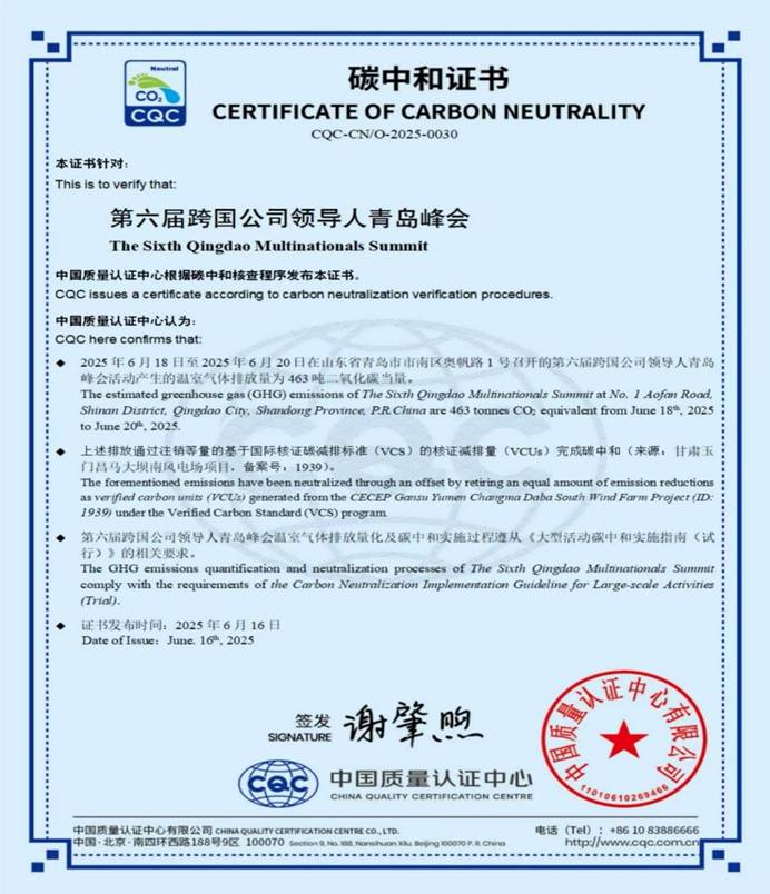 綠色低碳 | 中國中檢為第六屆跨國公司領(lǐng)導(dǎo)人青島峰會(huì)頒發(fā)“碳中和”證書