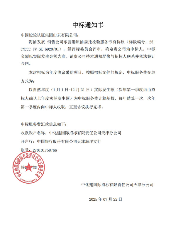 7月22日,中化建國(guó)際招標(biāo)有限責(zé)任公司天津分公司發(fā)布海油發(fā)展-銷售公司東營(yíng)港原油委托檢驗(yàn)服務(wù)專有協(xié)議中標(biāo)通知書(shū),山東公司所屬東營(yíng)公司成功中標(biāo)該項(xiàng)目。