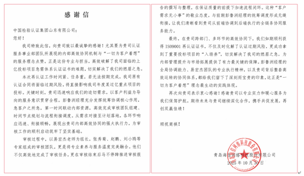 此次收到客戶感謝信,既是對(duì)中國中檢山東公司認(rèn)證服務(wù)工作的肯定,更是對(duì)未來服務(wù)提升的鞭策。中國中檢山東公司認(rèn)證服務(wù)事業(yè)部將以此為新起點(diǎn),持續(xù)深化“客戶至上、專業(yè)高效”的服務(wù)理念,不斷優(yōu)化服務(wù)流程、提升技術(shù)能力,為廣大客戶提供更具價(jià)值的檢驗(yàn)認(rèn)證解決方案,以實(shí)際行動(dòng)踐行央企使命擔(dān)當(dāng)。